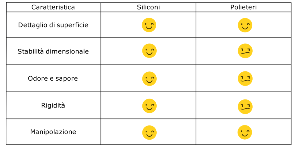I polivinilsilossani (PVS), meglio conosciuti come siliconi per addizione, creati nel corso degli anni 70, sono stati continuamente modificati in termini di composizione chimica in modo da ottenere un miglioramento ed una ottimizzazione delle performance cliniche: anche i siliconi non creano molecole di scarto durante la reazione chimica ma la caratteristica più interessante è il tempo di polimerizzazione, completa e rapida in pochi minuti. La stabilità dimensionale, l’accuratezza, il ritorno elastico e la possibilità di colare l’impronta a distanza di poco tempo lo rende uno dei materiali più performanti in questo settore. Un confronto tra questi due materiali è riportato sinteticamente in figura.